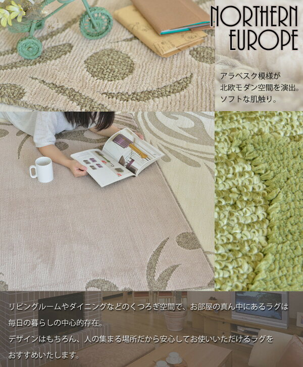 ふわふわ柔らか〜なマシュマロタッチラグ 防ダニ抗菌 ホットカーペット対応 遊び毛防止 安心の日本製カーペット レイヌ アラベスク模様が印象的。