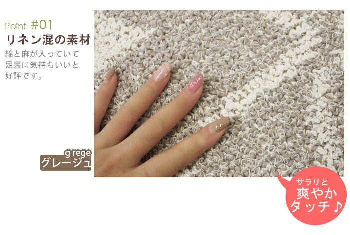 大人向けの淡いお色で他のインテリアにも合わせやすいです! 触り心地もサラッとしていて、踏み心地も気持ち良い商品です。